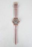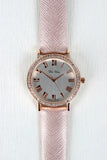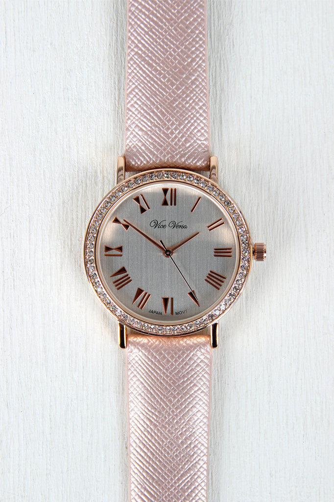 This watch features a vegan leather band, shimmer finish, cross hatch embossed detail, brushed metallic face, roman numerals, and rhinestones set in rim. Finished with an adjustable buckle closure.