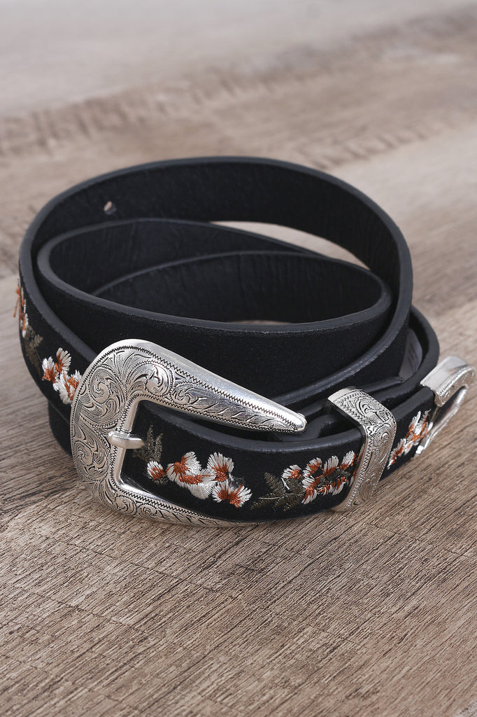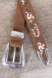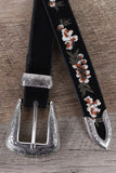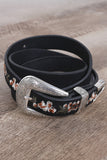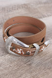 This belt features vegan leather, etched western style metal hardware, and finished with adjustable buckle closure.