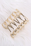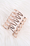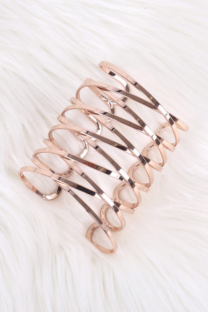 This wrist cuff bracelet features an asymmetrical design, flat wire with a crisscross construction, and scalloped open end for easy on/off.