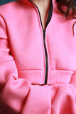 This two piece matching set features a scuba knit, crop jacket with statement ruched sleeves, zip-up front, and finished with matching high waisted leggings. Made in U.S.A. 95% Polyester, 5% Spandex.
