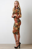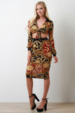 This matching set features a filigree print on stretchy fabrication, self-tie crop top with plunging collar neckline, and long cuffed sleeves. Matching skirt features a high waisted wide elasticized band and a midi length. Made in U.S.A. 95% Polyester, 5% Spandex.