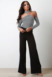 Striped Choker Cold Shoulder Long Sleeves Bodysuit