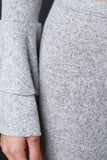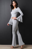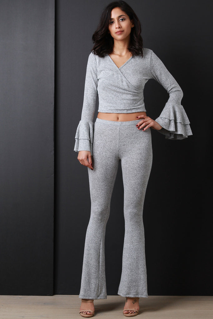This two piece matching set features soft marled knit, a crop top with a surplice neckline, long tiered bell sleeves, and high waisted flared cut pants. Accessories sold separately. Made in U.S.A. 100% Rayon.