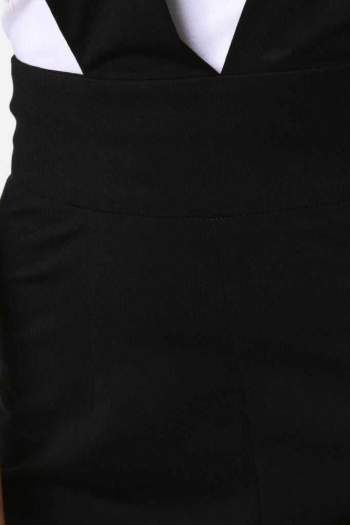 This overall jumpsuit features a high waist construction, v-overalls straps, zipper at rear, and wide leg cut. Accessory sold separately. Made in U.S.A. 44% Nylon, 52% Rayon, 4% Spandex.
