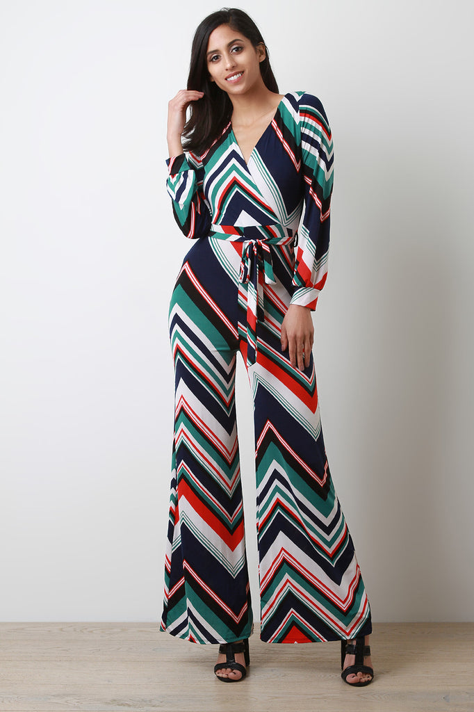 This jumpsuit features multi-color chevron pattern design, surplice neckline, long sleeves, wide palazzo cut legs, and self-tie waist sash. Accessory and top sold separately. Made in U.S.A. 92% Polyester, 8% Spandex.