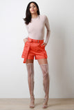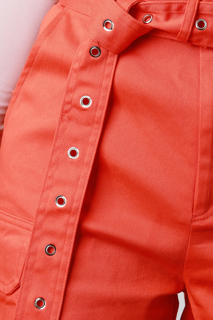 These shorts features a high rise with eyelet buckle belt, side pockets, flap cargo pockets, zipper fly, and hook clasp closure. Accessory sold separately. 100% Cotton.