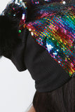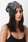 This beanie is slouchy style with a sequins at front and jersey ribbed knit at back. Topped with a faux fur pom. 100% Polyester.